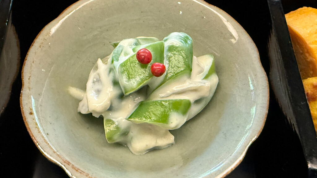 強肴は、鮮やかな緑のスナップエンドウと、淡いクリーム色の白和えが目を引きます。