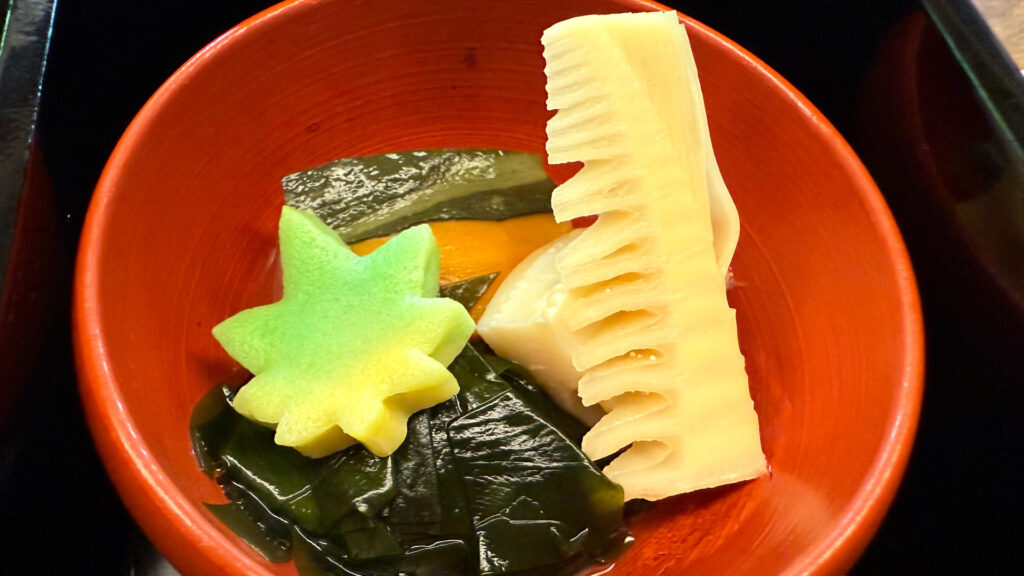山の幸だけでなく、ワカメを入れて海の幸も入れて、味が豊かになる炊き合わせでした。