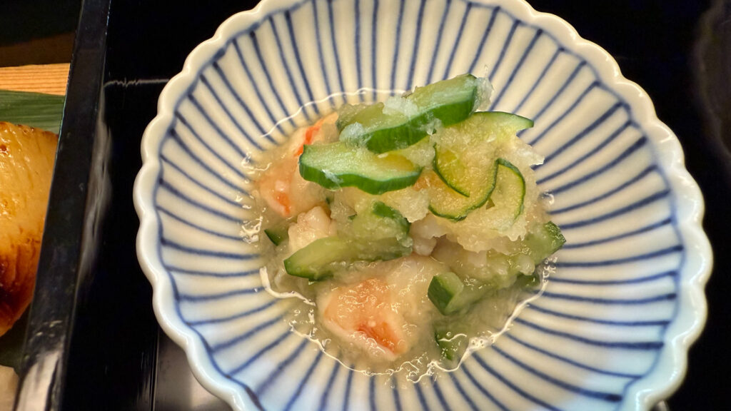 酢の物は胡瓜と海老のおろし和えです。