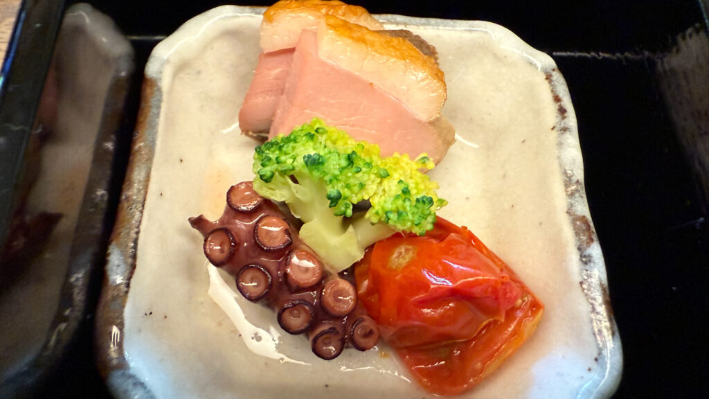 まず目を引くのは、赤系の鴨、蛸とトマトの中に緑のブロッコリーが入って、鮮やかです!