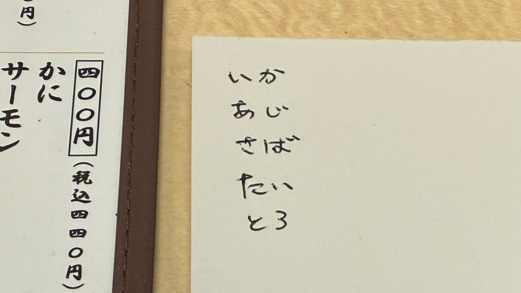 下の写真の白い紙から、旬のネタを頼みました!!
