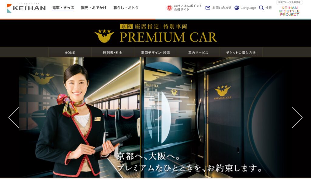 プレミアムカーとは、京阪電車が特急に設定しているラグジュアリーな車両で、乗務員も常に待機しています。