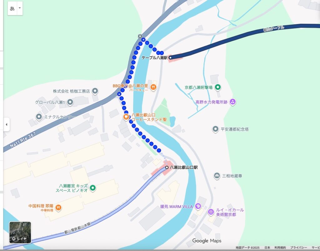 叡山電鉄 八瀬比叡山口駅から叡山ケーブルのケーブル八瀬駅までは10から15分くらい歩くわ。。
