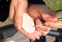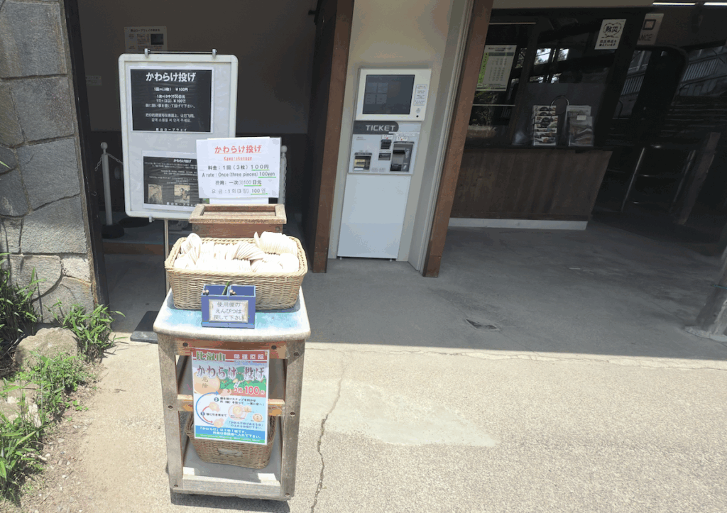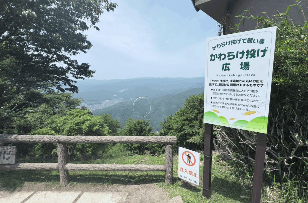 ケーブルカーが出発するまでまだ時間があったので、同じくかわらけ投げを楽しんでいた外国人観光客に混ざって、私たちも挑戦することにしました!
