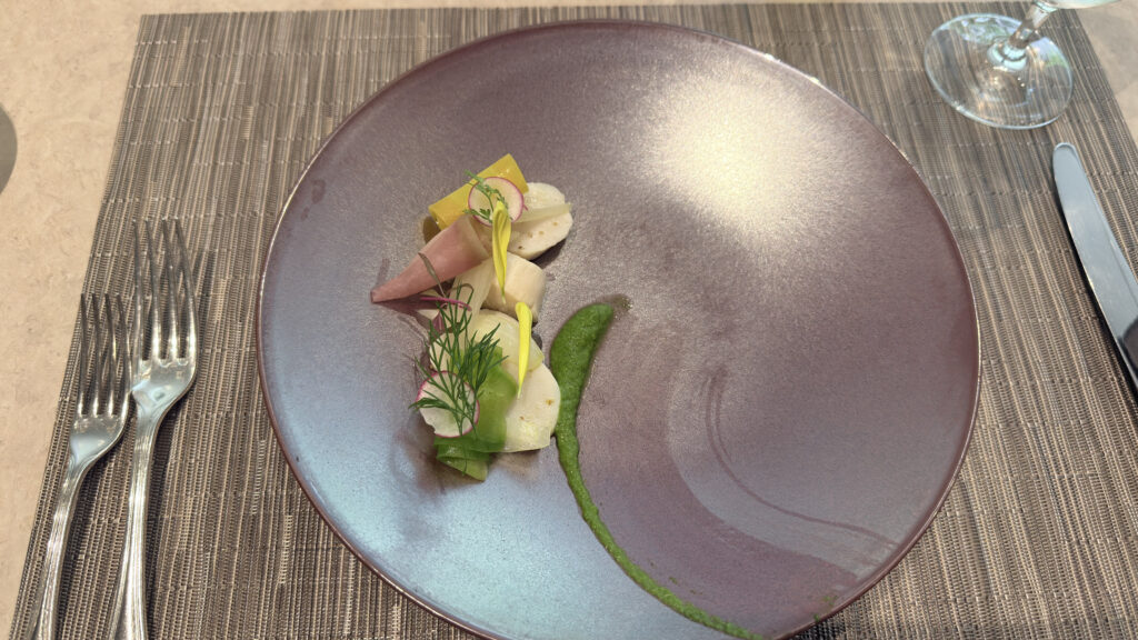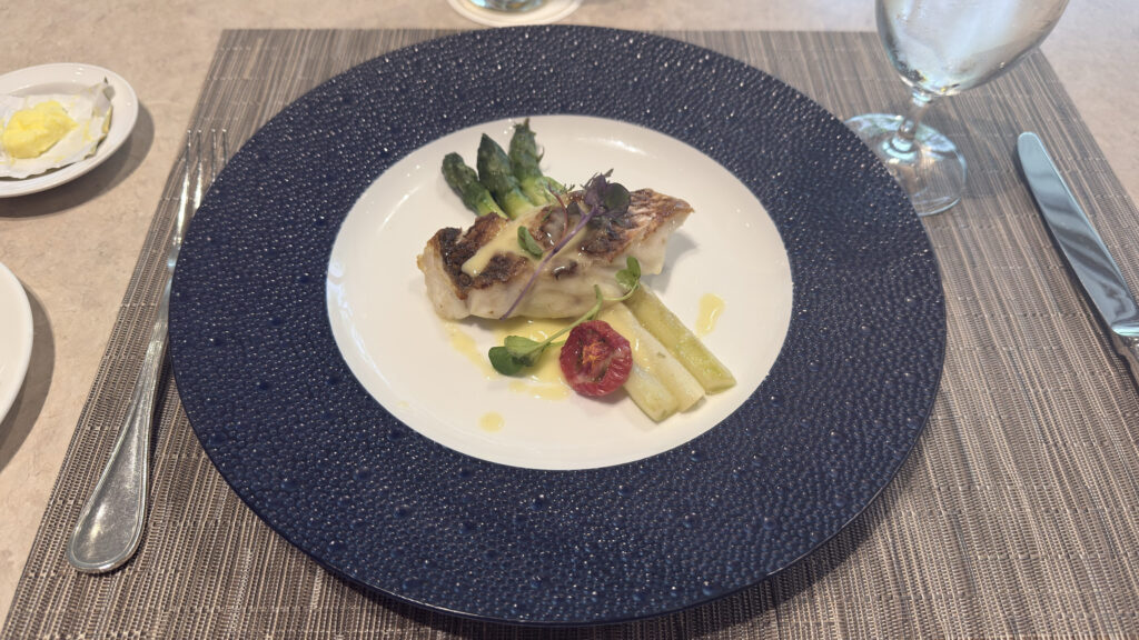 海の幸(スズキ)と山の幸(アスパラガス)を一緒に楽しめる調和のとれた一皿でした。