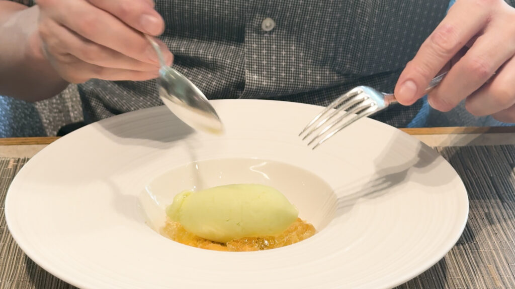 そのままホタテだけでも十分に美味しいけど、このひと皿では、それをあえて“引き立て合う関係”にしていて、味に奥行きと広がりが生まれているわ。。