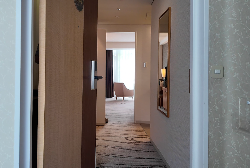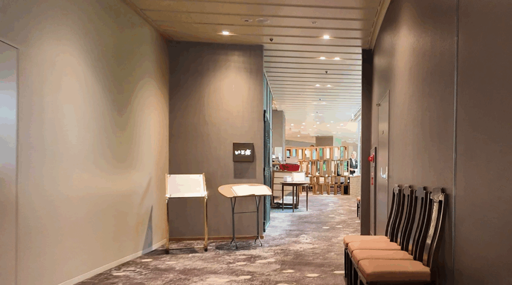 ホテルのロビーを抜け、静かな廊下を進むと、外の景色がぱっと開けるガラス張りの空間に辿り着きます。