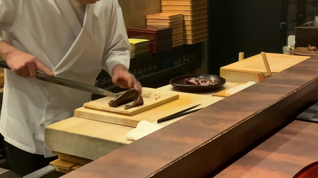 店主は包丁で丁寧に切り身にして準備していました。