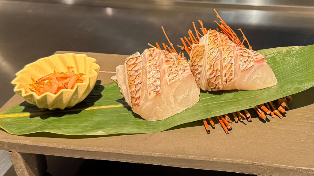 シェフが愛媛の真鯛と静岡産の桜海老を見せてくれます。