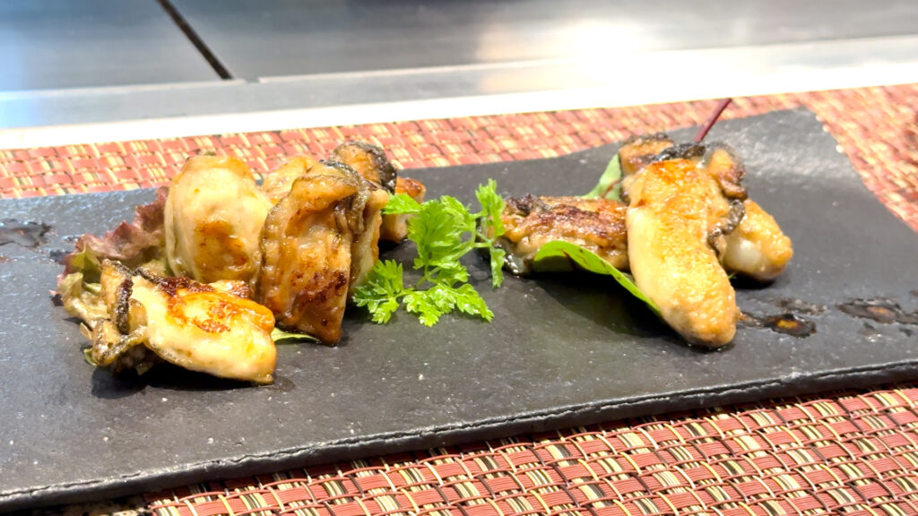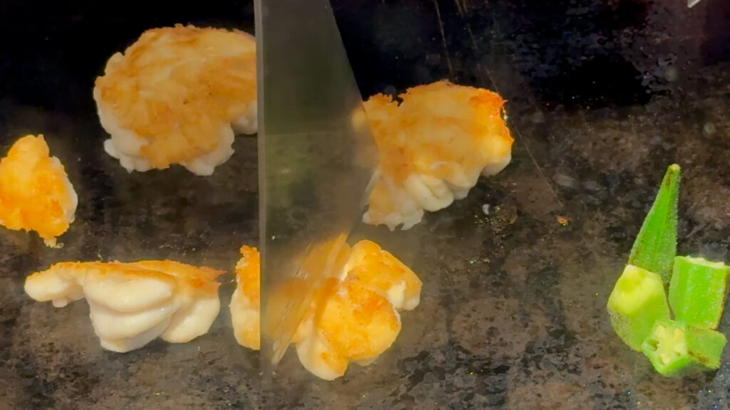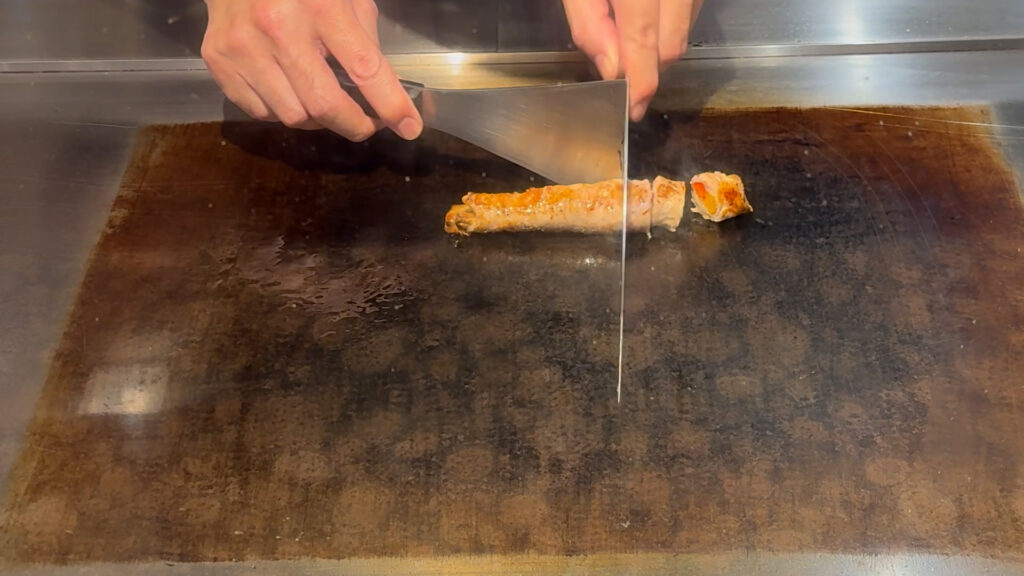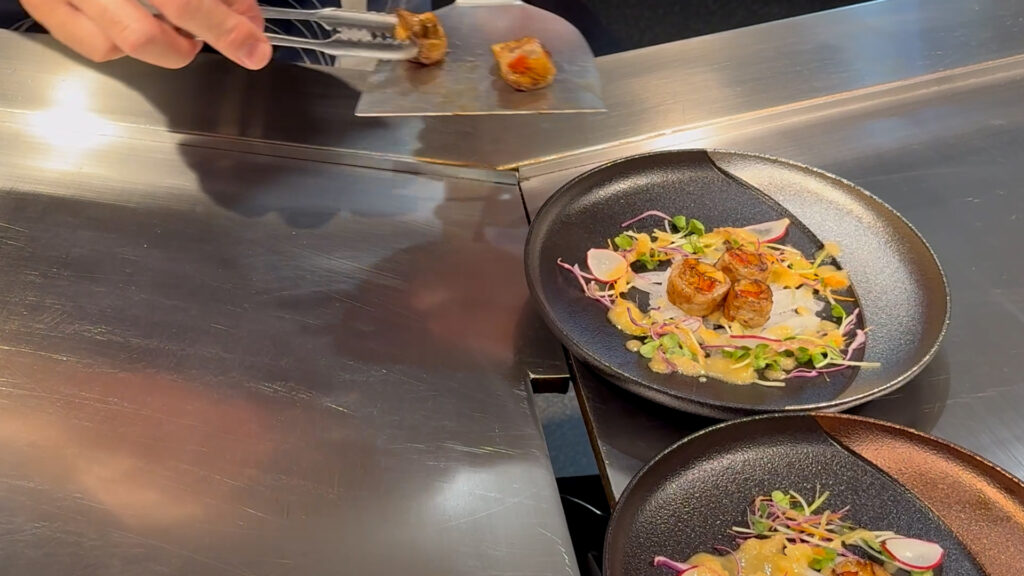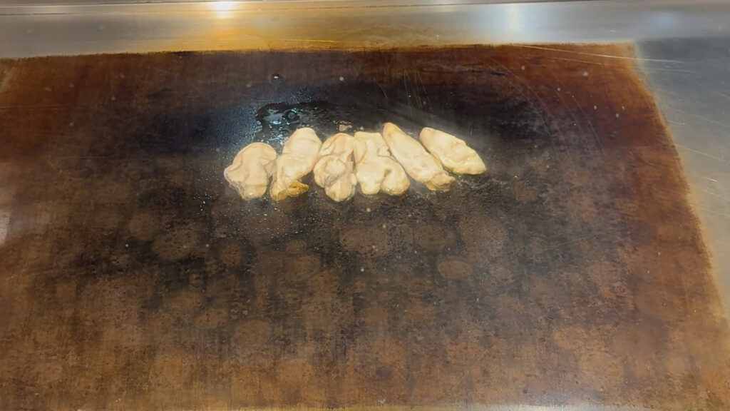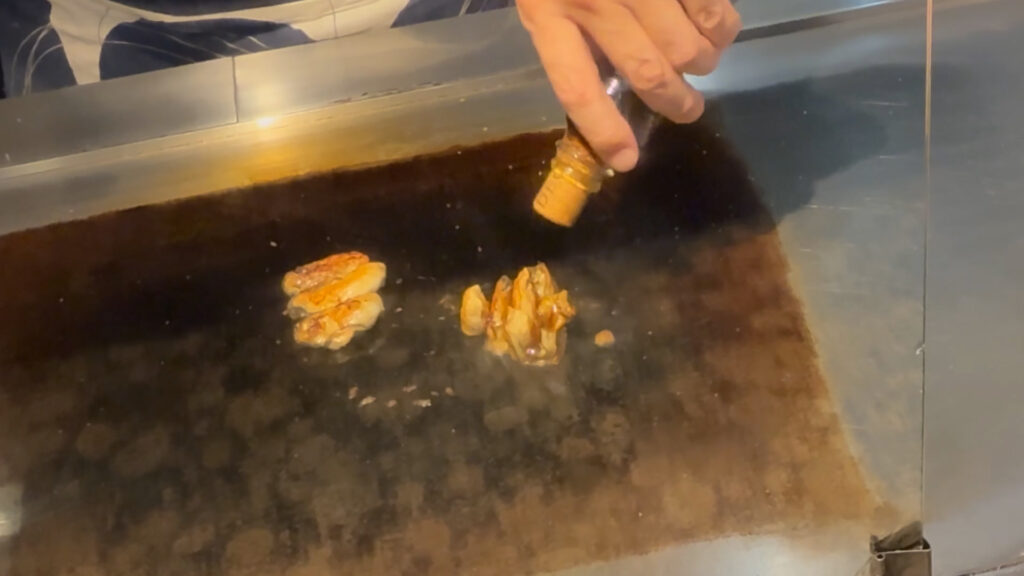 シェフが北海道のタラの白子を見せてくれて、鉄板で焼き始めています。