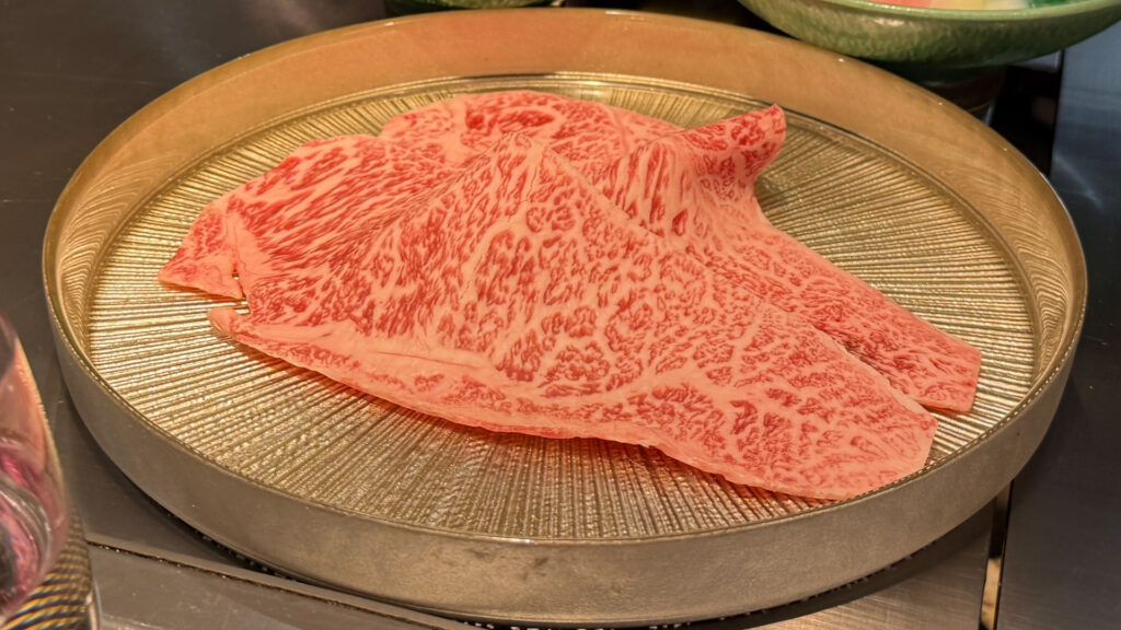 シェフが取り分けてくれたすき焼きのオリーブ牛、完成です!!