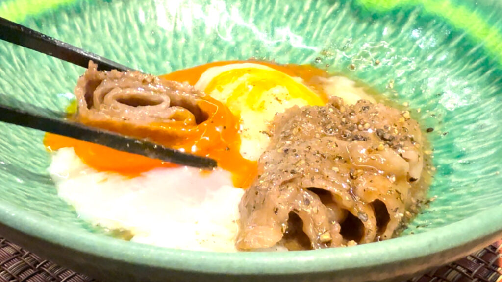 蘭王卵にくぐらせてすき焼きのオリーブ牛を食べた瞬間、甘みと旨味の波が口いっぱいに広がります。